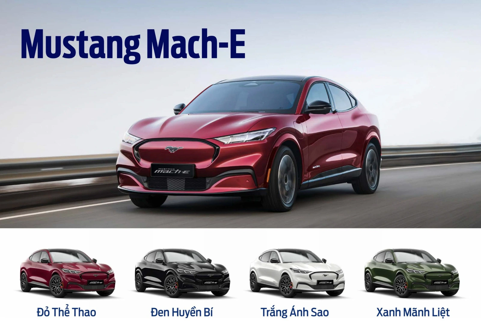 Ford Mustang Mach-E được bán ra tại thị trường Việt Nam với các tùy chọn màu sắc có sẵn cho khách hàng Việt Nam lựa chọn bao gồm: Đỏ thể thao, Đen huyền bì, Trắng ánh sao, Xanh mãnh liệt.