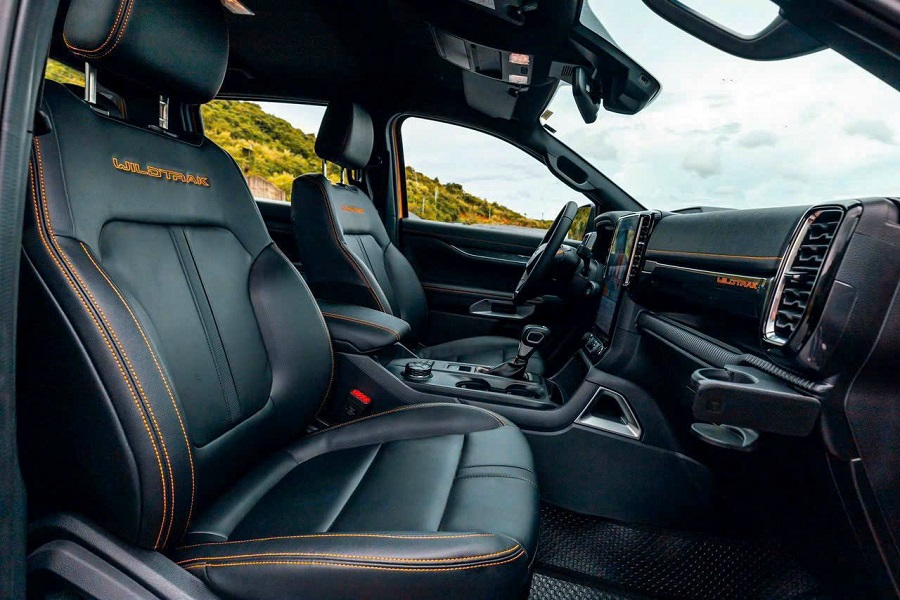 Với nội thất bằng gỗ mun tuyệt đẹp, Ranger Wildtrak gợi lên nét độc đáo với đường chỉ màu cam Cyber, các điểm nhấn màu xám Boulder và các điểm tiếp xúc màu nhôm Satin cao cấp. Và không thể thiếu logo ‘Wildtrak’ đặc trưng màu cam Cyber trên ghế.