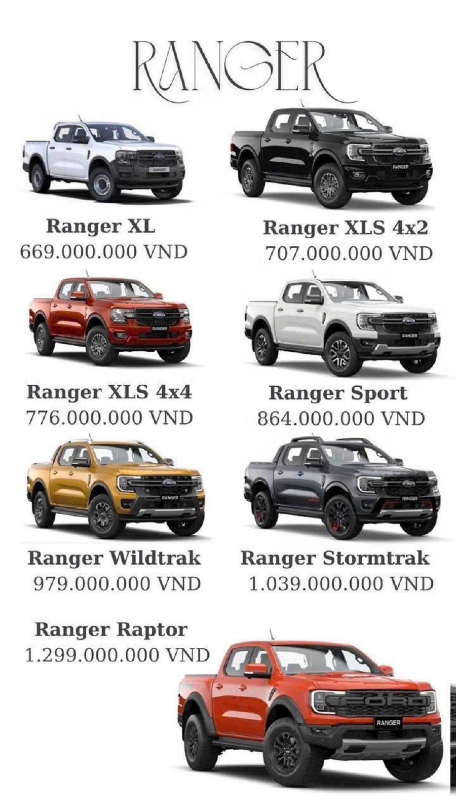 Bước sang thế hệ mới, giá xe Ford Ranger cho từng phiên bản cụ thể như sau: