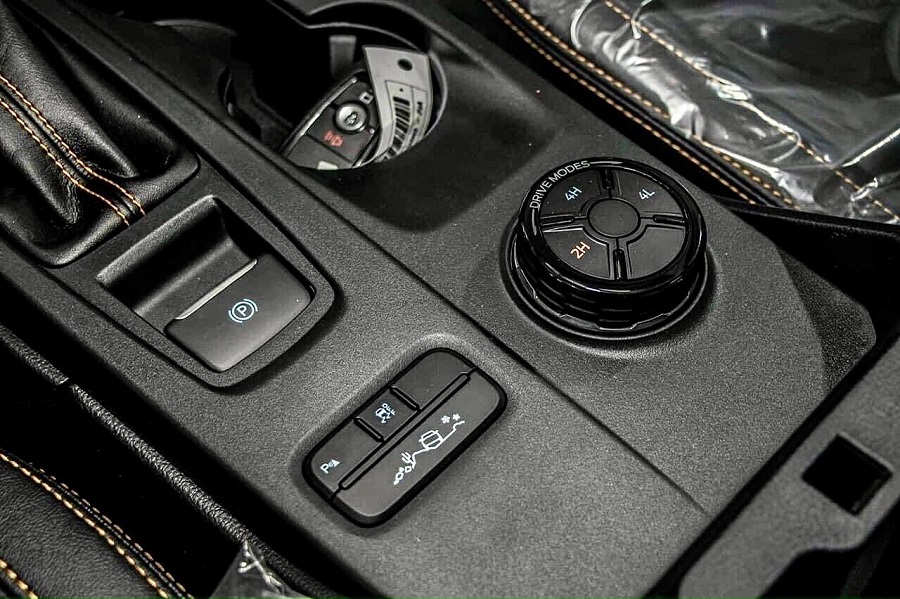 Đặt ngay bên dưới là hệ thống phanh tay điện tử cùng hệ thống nút chỉnh chế độ vận hành. Trên các phiên bản dẫn động hai cầu, nút chỉnh chế độ lái cũng kiêm thêm nút gài cầu điện tử cho xe. Xe có tổng cộng 3 chế độ gài cầu là 2H (chế độ 1 cầu thông thường), 4H (chế độ 2 cầu tốc độ cao) và 4L (2 cầu tốc độ thấp để tối ưu khả năng vượt địa hình khó). Việc không có chế độ 4A (2 cầu tự động) bị nhiều chuyên gia và khách hàng đánh giá là thiếu sót đáng tiếc trên Ford Ranger 2025.