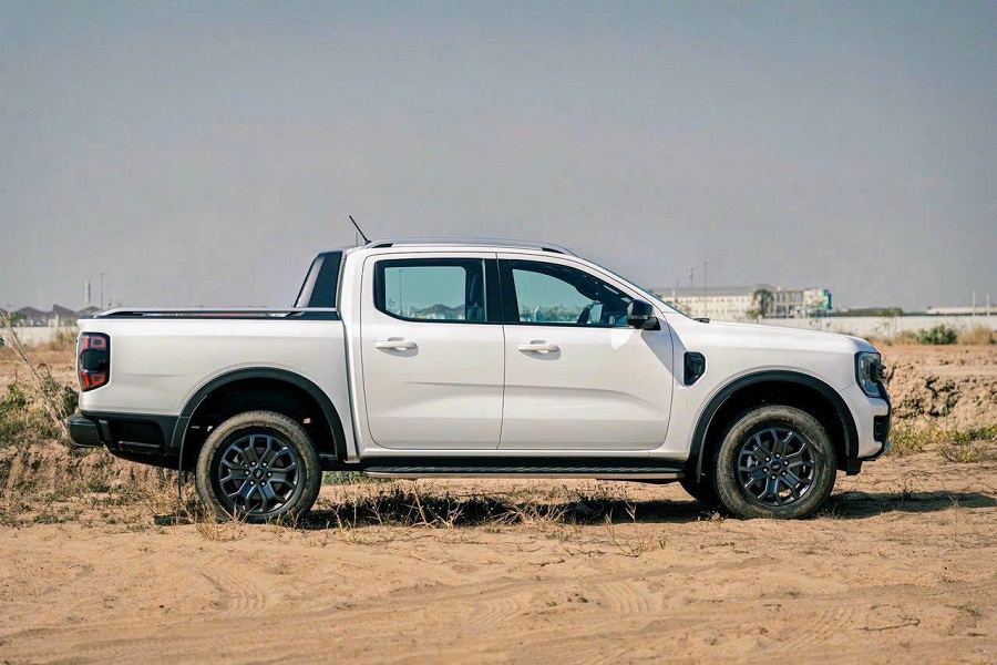 Với chiều dài cơ sở được gia tăng, Ford Ranger 2025 tạo ấn tượng trường xe và bề thế hơn thế hệ tiền nhiệm. Các đường gân dập nổi dọc hông xe càng đóng góp thêm vào vẻ ngoài vạm vỡ và nam tính của mẫu bán tải xứ Cờ Hoa. Trên phiên bản Wildtrak cao cấp, “mang cá” và gương chiếu hậu được sơn đen tạo điểm nhấn thể thao.