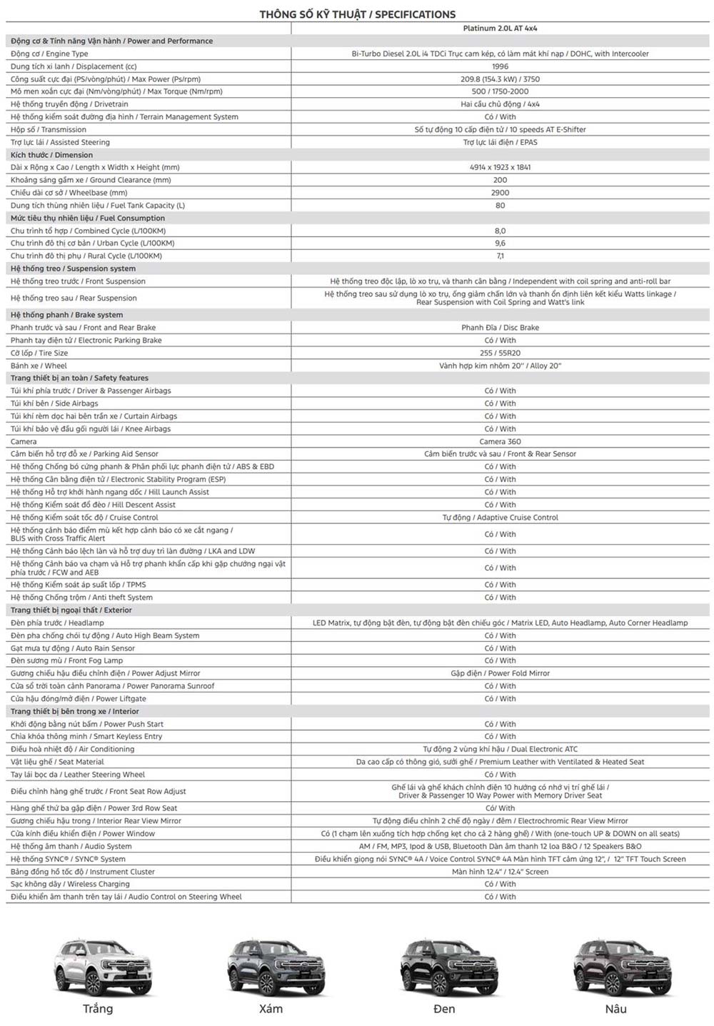 Dưới đây là bảng cập nhật đầy đủ và chi tiết thông số kỹ thuật xe Ford Everest 2026 thế hệ mới. Kính mời quý khách hàng cùng tham khảo!